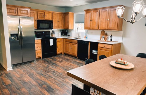 This meticulously designed cabin offers an array of features tailored to enhance your stay. Enjoy modern comforts like a fully equipped kitchen, high-speed WiFi, and plush new beds. Whether you unwind by the wood-burning fireplace or challenge your loved ones to a game at the foosball table, there is something for everyone. Gather around the exterior firepit for storytelling under the stars, or catch every thrilling moment of the NFL games with Sunday Ticket and Redzone on large TVs throughout the space. Every corner is crafted for relaxation and entertainment, ensuring that your wedding experience is nothing short of magical.