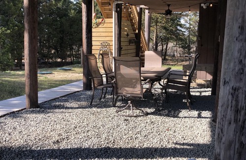 The outdoor ground space features two ceiling fans and a patio table that seats 6 that makes a perfect entertainment space.