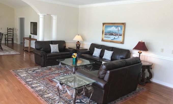 This gated home was built in 1993, has hardwood and tile floors, 2 large balconies, a full kitchen with an eating area, formal dining room, living room, a media room featuring AppleTV, and 2 fire places. Ground floor has 3 bedrooms including the master, and 2.5 baths. Two more bedrooms, each with a private bath, are upstairs. There are 2 king sized beds, 3 queen sized beds, a full sized bed, a twin bed, a and 2 cribs available.