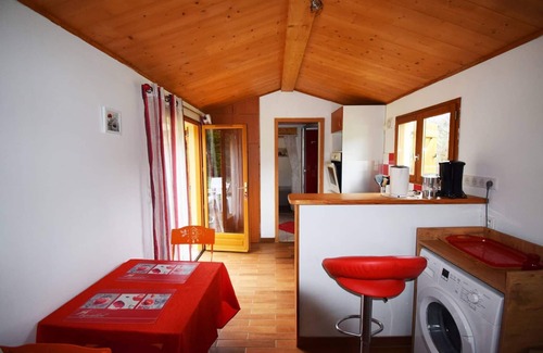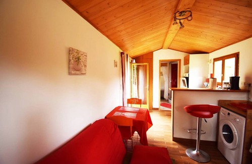 Le gîte est constitué d'un petit salon/séjour avec cuisine équipée, d'une chambre avec un grand lit double en 140cm et d'une salle d'eau entre les deux pièce pouvant être indépendante par deux portes coulissantes. Le salon comprend un clic-clac pouvant accueillir une personne ou deux enfants. Le gîte est situé à proximité d’une route peu passagère.