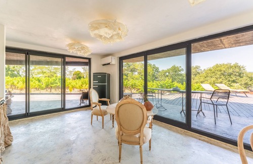 — a spacious living area with generous volumes, extended by large picture windows opening onto a private, secluded terrace, offering a breathtaking view stretching from the Gard to the Alps,