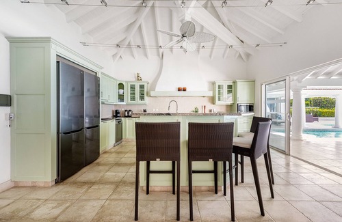 The interior spaces are spacious and airy; completely air-conditioned or fully open to the sea's breeze. Travertine floors flow inside to outside creating an elegantly seamless transition. The decor mixes contemporary shapes with European antiques. Fabulous art and accessories have a museum-like feel yet this is a comfortable, charming, and exotic space to simply relax and enjoy the view. Adjacent to the living room is a large semi-private media room and library. The fabulous and well equipped French Caribbean style kitchen in soft greens and grey marble has sea views and a gorgeous Lacanche professional stove. A built-in outdoor barbeque provides additional cooking spaces.