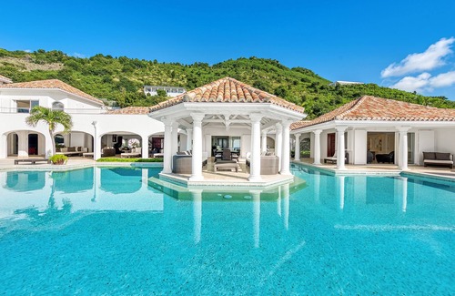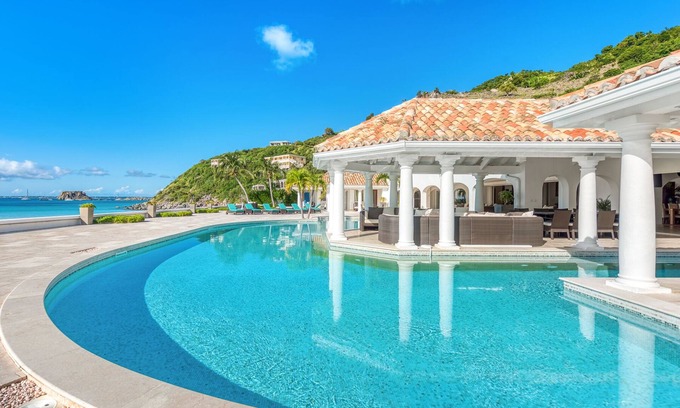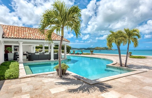 Covered and open terraces, defined by columns and arches, span the length of the villa. The large horseshoe-shaped heated pool sits at the sea's edge. In the center of the horseshoe is a covered loggia for relaxing and dining poolside. A hot tub sits nearby for ultimate relaxation. Additionally, the villa has an on-site manager skilled in taking care of your needs and easy access down the beach to Grand Case Beach Club restaurant and bar.