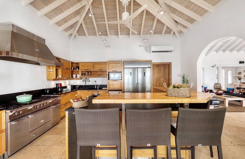 Covered and open terraces span the length of this estate villa. The large horseshoe-shaped heated pool sits at the sea's edge. In the center of the horseshoe is a covered loggia for relaxing by the pool. A hot tub sits near sits nearby for ultimate relaxation. Additionally, the villa also has an onsite manager skilled in taking care of your needs and easy access down the beach to Grand Case Beach Club restaurant and bar.