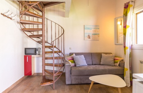 From here the entrance leads to a high ceiling'd open sitting/dining area and fully equipped kitchen. The bathroom is fitted with shower/bath, WC and washbasin. A spiral staircase leads up to a galleried area with a double bed, wardrobe and chest of drawers. The decor is tastefully designed, combining natural materials in a modern style with care and attention to detail.