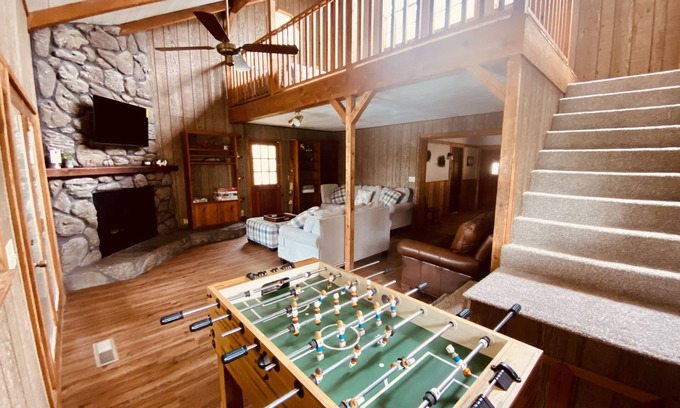 Enough space for the whole family in this 4 bedroom Logan Martin Lake Cabin. Located centrally near Wake zone restaurant and many other Bar and Eateries, all accessible by boat and car. This cabin features year round deep water with floating 23ft boat slip for guest use. The cabin sleeps up to at least 12, with plenty of space to spare in common areas. Charcoal Grill, Fireplace, 3 spacious porches, Fooseball table, Pack n play, High chair, 4 tvs, fully equipped kitchen, and tons of Boat Parking.