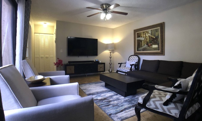Located just 20 minutes from Florida's best beaches, this 2-bedroom, 3-bath home with a private large patio has a relaxed resort vibe.