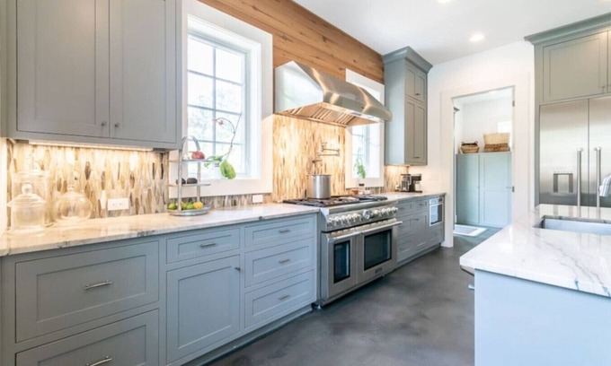 Upon arrival, the grandeur of the white farmhouse-style front porch, adorned with inviting rocking chairs, welcomes you. Picture-perfect and ready, it sets the tone for the elegance within. As you step inside, a custom wood-crafted ceiling and exquisite inlay tiles create an immediate sense of spa-like tranquility, ensuring that every moment in this home is one of refined relaxation.