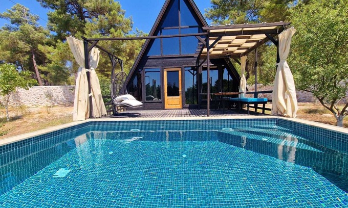 This A-Frame property is made entirely of natural wood and is one of only16 villas at the Benim Koy complex. The villa is well-equipped with a kitchen that is open plan to the lounge area. Free Wi-Fi, dishwasher, washing machine and TV are there to compliment your stay. There are two bedrooms - 1 x twin room on the ground floor and 1 x double room on the first floor, the bathroom is also on the ground floor.