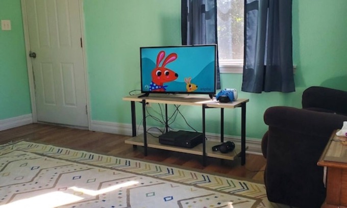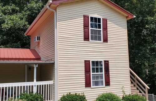 Is a two room and bathroom on second floor separate entrance. Have small fridge,tv, coffee maker,ac and complete bathroom,3 queen bed and a recliner. Tv is smart with Netflix,Hulu,Disney and local channels.one parking on parking lot. And I nice view.