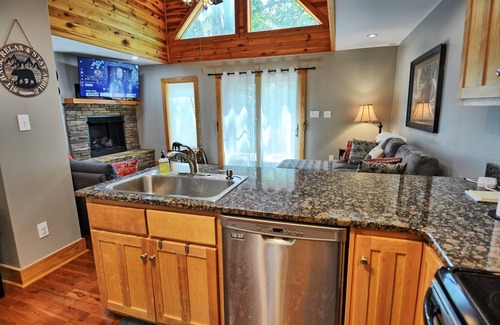 Inside: As you enter, you’re greeted with an open floor plan. The living room boasts comfortable seating, seasonal gas fireplace, Fire TV with streaming apps (you will need to use your login information), and doors that will lead to the outside deck.