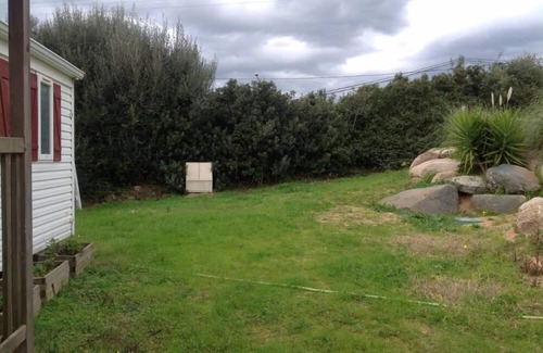 The mobile home is fully equipped, it has air conditioning, a covered terrace and a garden area. The owners' house is on the same plot.