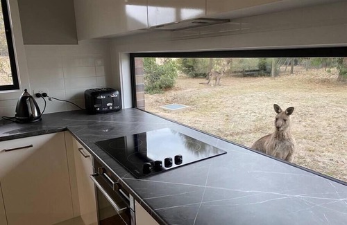 Indulge in the charm of Piccolo Retreat, nestled in a quiet cul-de-sac on a sprawling block with picturesque farmland vistas. Immerse yourself in the beauty of the mountain range from the expansive kitchen, fully equipped with modern conveniences, including a dishwasher and electric stove top. Marvel at the panoramic views through the large window, where kangaroos and wildlife often grace the National Park landscape.