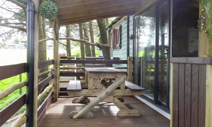On the small holding you can there are resident goats and see the chickens, this spot is also great for your dog with an enclosed woodland area and plenty of seating to enjoy to view. Here you can enjoy the beautiful sunsets and countryside views from your covered terrace with seating. Butterfly Lodge offers a great space to discover this wonderful area, the master bedroom is light and airy and offers a great nights sleep with full size bunk beds in the second bedroom, the open plan kitchen, dining and living area is the perfect social space and leads through patio doors onto your covered terrace with beautiful views, a great way to start your morning with cup or Tea or Coffee.