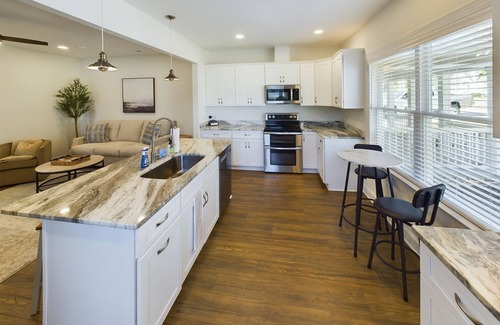 Inside, you’ll find a bright, open floor plan with all-new furnishings and amenities. The fully equipped kitchen is perfect for preparing meals, and the cozy living area is a great space to unwind after a day of hiking or exploring nearby attractions. The bedroom is tastefully designed with comfort in mind, and comes with its own private bathroom for added convenience.