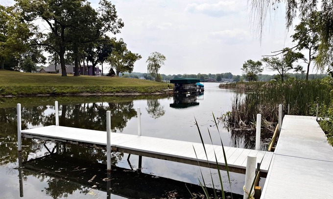 The dock is available if you bring a boat. Boat rental is available at the Corner Landing nearby. You can conveniently navigate your rental boat directly from Corner Landing rental to our dock. Enjoy the seasonal boat rental services offered at Corner Landing (CornerLanding.net) and take advantage of the convenience of parking your boat at our private dock. The easement to the dock is about a 200 yard walk across a yard, with access to Snow Lake, part of the Chain of Lakes that includes Lake James, Jimmerson Lake, and Big Otter Lake. Please note there is not a swimmable shoreline near the private dock. However, there is a public access site at the end of our road where you can swim and also, and just three miles away, you can find Pokagon State Park, which offers a sandy beach area. Additionally, there are various enjoyable attractions such as movie theaters, winery tours, as well as boat launches, shopping centers, and restaurants in the area.