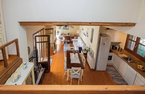 Loulis House is a wonderful 3 bedroom 2 storey Cycladic house with sea views in the pretty seaside town of Finikias on the unspoiled island of Syros. Entering into the spacious open plan living dining area with wooden beams, you will feel very comfortable. Nautical prints and carefully chosen soft furnishings add the charm. The modern kitchen is well equipped with everything that you could possibly need. The living room leads onto the spacious shaded terrace with dining table which is where you will spend much of your time. Above the living area is a mezzanine with sofa bed for an extra guest. This leads onto the three pretty bedrooms and two bathrooms - The master bedroom has it's own balcony with breathtaking views across the sailing boats moored in the harbour.