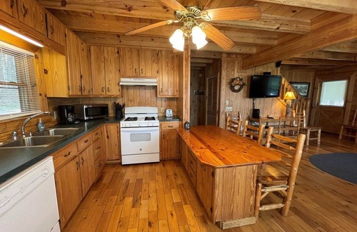 Inside this log cabin is a roomy great room with gas log fireplace, 42" Flatscreen TV with Smart Blue Ray player. WIFI. Fully equipped kitchen with dishwasher, toaster, microwave, coffee maker, crock pot, blender, mixer, etc.