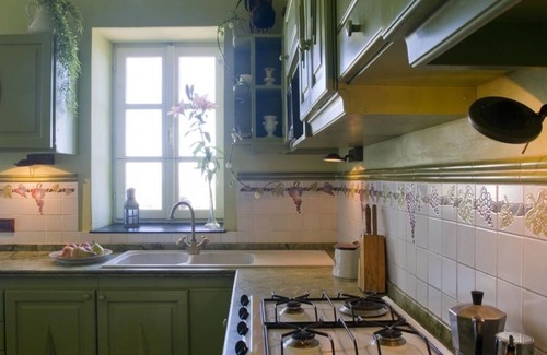 With our apartment you can expect a picturesque jewel on 150 square meters, in a medieval village on a ridge on the Riviera in front of the French border, between Imperia u. San Remo. The apartment gets its flair from old furniture, cross vaults (15th century), trompe l’oeil wall painting, art nouveau windows in the room doors, old mirrors and art nouveau lamps, cotto flooring, valuable fabrics and its special color tones. The 25 sqm terrace overlooks olive groves to the Mediterranean. There are three bedrooms with up to 5 -6 beds in total (see below), a large medium-sized living room, well-equipped kitchen, large bathroom, large hallway, satellite TV, laundry and dishwasher.