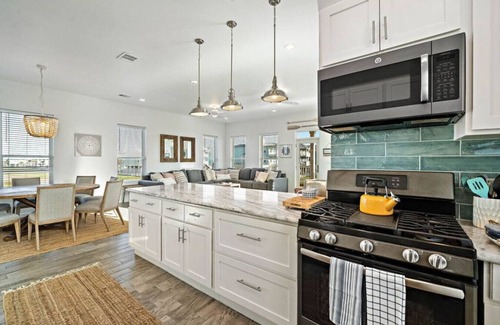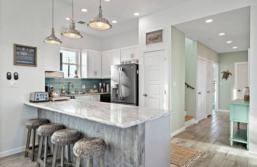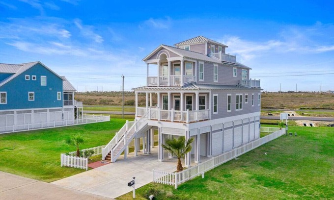 Effortlessly elegant, this three-story Beachside Village home has a chic, polished style and a picture-perfect, private location. With four breezy balconies, a barbeque area, an inviting open floor plan, a lush green lawn, and room for 18 people— this holiday home is also just steps away from the sandy beach. You’ll also be tucked safely into a private, gated community and be close to the Seawall and the Strand. Relax, recharge, and reconnect at this dazzling Texas Gulf Coast vacation home.