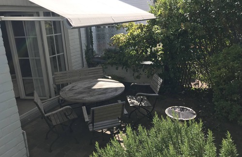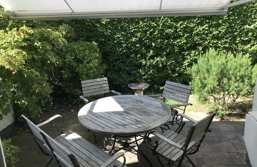 Pomme de Pin has a private driveway, you can also park along the road (very quiet street). There is a front garden, a path with small side garden and barbecue aside and a garden with terrace behind the house. The terrace on the west side, has a garden table and six chairs, and is directly accessible from the living room.