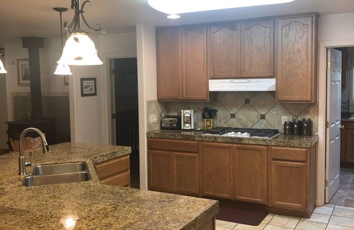 The Great room includes sectional with 3 electric reclines, and a love seat to relax on while watching TV, relaxing with a book,or enjoying the comfort and warmth from the freestanding wood stove. The French doors open onto a nice covered patio where guests can enjoy the quiet beauty, and surroundings.