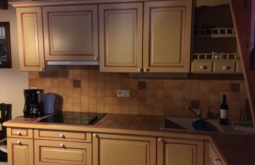• The ground floor comprises the living room with fireplace and open kitchen. This is equipped with four electric hobs, and contains all necessary appliances including a microwave (combi) oven and dishwasher. The adjoining bathroom has a toilet, sink with cupboard and spacious shower.