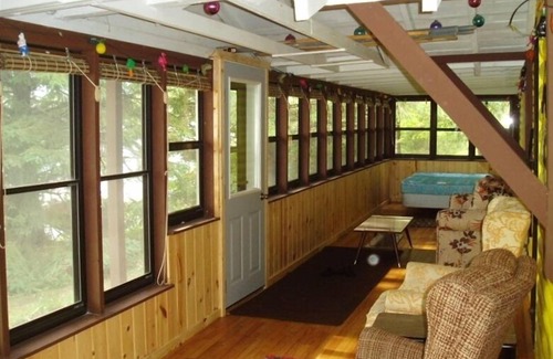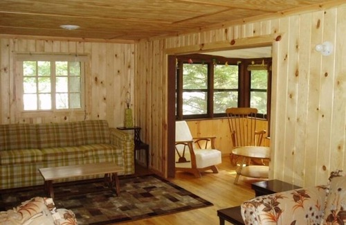 This log cabin is lake level with a large screen porch overlooking the lakeshore. Perfect for watching loons or just relaxing after a day on the lake.