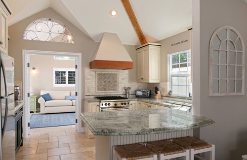 Sunny master suite with queen size bed, skylight, a stunning adjoining bathroom and French doors that open to the patio. The second bedroom is cozy with a comfortable bunk bed (3rd bed a trundle), and it's own tastefully designed adjoining bathroom.