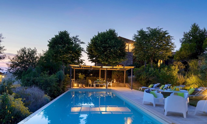 Set in the enchanting scenery of the Val di Cecina, just outside the tiny borgo of Lustignano (900m), between the area of the Bolgheri wineries and the beaches of Baratti, San Vincenzo and Populonia, Pieve di San Giovanni enjoys a happy hilly position 390 m above sea level, with open views on every side. The complex, dating from 1200 and consisting of the parish church and attached pilgrims' hospital, combines the beauty of the old stone buildings with the charm and comfort of the most tasteful contemporary design. The refined renovation has preserved some of the elements that characterised the original building that spreads from the central courtyard: the exposed stone walls, the high ceilings with the original wooden truss and exposed beams and even the base of the baptismal font, highlighted by the glass flooring in the imposing hall which originally housed the church and now contains a long wooden table made from a single tree trunk and a particular circular suspended fireplace in corten. The prestigious furnishings and accessories, the large modern kitchen, the elegant bedrooms with modern private bathrooms, the gym and the wellness area with heated indoor pool and Turkish bath, all define the caliber of the structure and make it a fantastic destination for those who love the peaceful atmosphere of the countryside without renouncing luxury and comfort. The garden, an oasis of peace that offers enchanting panoramas on all sides, and the beautiful infinity pool complete the programme of a perfect stay enriched by a variety of destinations easily reached thanks to the complicity of wonderful panoramic roads