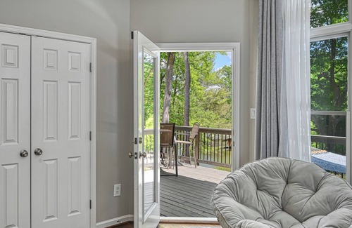 The first bedroom upstairs, dubbed "Lake Anna Aerie" is a nod to the amazing eagle's view it offers. It undoubtedly has the best view of the lake in the house, a king bed, and a spacious closet.