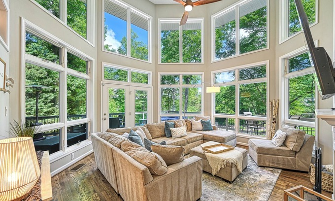 Our home is super cozy and has a TON of natural light thanks to the large, floor-to-ceiling windows. We have a comfortable sectional in the living area with a 70” Roku smart tv to stream your favorite shows, as well as a wood-burning fireplace, which is perfect for a movie night. We have a large kitchen and an 8-person dining room table with an additional 2 seats at the kitchen island; perfect for large groups, or the entire family. There is a dedicated workspace upstairs, great for remote work. We have a screened-in porch right off the kitchen with a cozy loveseat and hanging swinging chair that is ideal for morning coffee and decompressing after a long lake day. Enjoy grilling delicious BBQ on the propane gas grill, dining, or just soaking up the views on the furnished wrap-around deck. Perhaps read a book or take a nap in the hammock. We also have a beautiful, newly finished basement that has an entertainment area with convertible pool table, ping pong table, and dining table. You will also find the "Pigeon Cove Hideaway" in the basement complete with lounge furnishings, shuffleboard, tv, and fireplace. Just outside you will find our brand new patio complete with hot tub, firepit and lounge area, which is perfect for taking in those gorgeous Lake Anna views with your friends and family.
