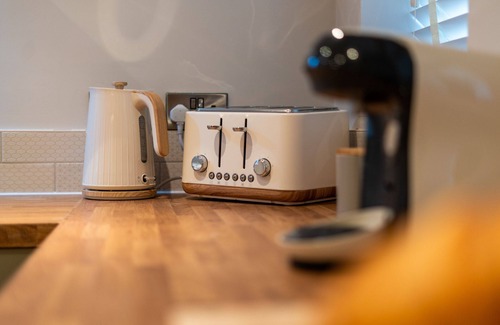 The country-style kitchen provides everything you need to self-cater with ease, including an electric induction hob, an oven, a toaster, a kettle, a coffee machine, a dishwasher, a fridge/freezer and a washing machine. Gather around the four-seater dining table for a delicious home-cooked meal or an evening of card games and chatter.