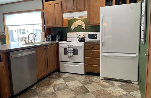 The kitchen is stocked with all necessary cookware and accessories, basic seasonings, coffee/tea, and has full-sized appliances.