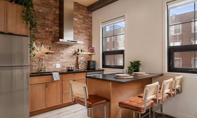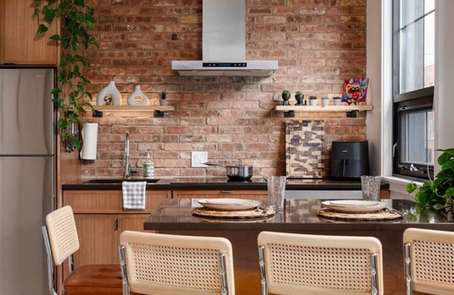 Kitchen: Fully equipped with brand new stainless steel appliances, including a dishwasher (cleaning pods provided) and an air fryer. The kitchen island serves as a central gathering spot, offering counter space for meal prep and casual dining. The exposed Chicago brick wall adds a touch of charm and character to the space.
