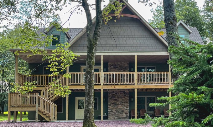 Discover the perfect blend of luxury and nature at Pine Crest Lodge, a secluded 8-bedroom chalet with a bonus loft located in the heart of the Pocono Mountains. Nestled on a secluded paper street, this lodge offers unmatched privacy, frequent wildlife sightings—including deer, black bears, and various bird species—and is walking distance to the lake!