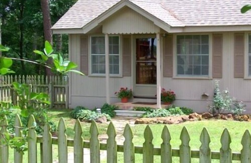 Fully furnished cottage in the woods with backyard opening to pine trees and four acre pond. Cottage has wood floors, window air conditioners and homey furnishings. Perfect for a family retreat or a romantic getaway. Located on our 50 acre working ranch, Pine Grove Cottage is tucked away on its own corner of the property with private drive and gated entrance. A sun room runs the length of the house in the back and looks out on the pine grove and lake beyond and serves as a third bedroom. An open family room/dining/kitchen is perfect for family gatherings. Guests are free to roam the ranch property which includes expanses of wooded acreage where wildlife and birds abound. Fishing on the lake is available on a "catch and release" basis to ensure fishing remains good for future guests. Lakes are stocked with bass, catfish and bream.