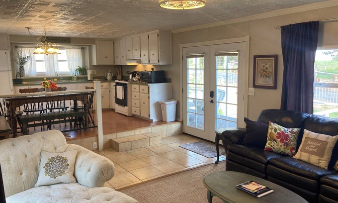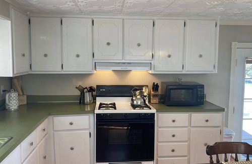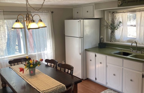 Enjoy our 3 bedroom, 1 bath, cottage with relaxing vintage charm. With a fully stocked kitchen including spice rack to make your own meals or to enjoy take out. Grab a cup and pick out a fun new tea or enjoy a local cup of coffee from our fully stocked coffee/tea bar. Relax in our open living room on a leather couch with two recliners, catching up on your favorite show on a 50 inch, 4K, smart TV. Snuggle up to a good book on our cozy reading chaise lounge. Enjoy the birds singing in the morning, or frogs croaking in the evening on our covered deck. Take a step back in time while you shower in our full, vintage bath with new shower head and fluffy towels. Get a restful sleep on our comfortable pillow top queen bed or memory foam full size bed. Let the kids pick between the twin bed or twin trundle in our kid friendly room.