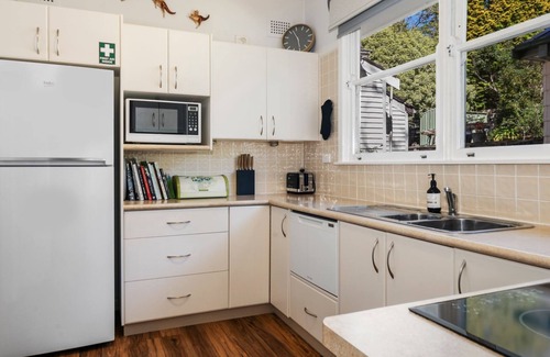 The two-bedroom cottage has a separate dining room with seating for six looking out of a large corner window facing two directions plus a cosy lounge room featuring a gas log fireplace. With gas central heating & cooling, you’ll be warm in winter and cool in summer. The master bedroom has a king bed, and the second bedroom has a double bed, maximum guests is 4.