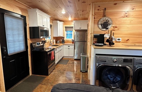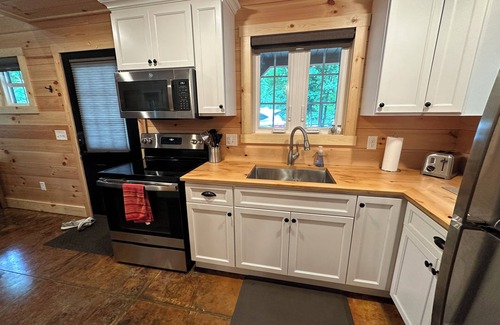 Once you enter into the shared driveway you will pass through stone pillars and gates that will take you right The Pine Ridge Cabin House. Please park on the side of the cabin (2 car maximum). Once you enter through the keypad door you will enter into a cozy space that has everything you need for a quiet and peaceful getaway. There are shades for most windows and doors for your privacy. There are two triangle shaped windows at the top peak of the living room wall that allows for natural light to come into the indoor space. These two windows do not have blinds and there will be natural light from the adjacent wooded area that comes through during daylight hours. The upstairs loft is the main bedroom equipped with a King size bed, wardrobe and desk area. There is no private door to the loft area. There is a second full-size sofa bed in the main living room. Sheets, pillows and blankets are located in the upstairs wardrobe. Before using the sofa bed, roll the cart below the t.v. to the right (behind the table and chairs). You will then be able to pull the sofa bed out without moving the couch. The bathroom is equipped with a small stand up shower, toilet and sink. Towels, washcloths, and hair dryer are supplied. Limited supply of shampoo, conditioner, body wash, toilet paper and paper towels are also provided upon arrival. The kitchen has a full size refrigerator with freezer, microwave and oven/stove. It is well equipped with everything you need to make breakfast/lunch/dinner. There is also a gas grill located on the covered back patio area. Please move the grill away from the cabin siding when operating and there are grilling utensils in the drawer next to the refrigerator. An outdoor dining table and various outdoor seating areas are available for your enjoyment. Be sure to take advantage of the fire pit as fire wood is provided free of charge. This beautiful piece of property is nestled back against the woods and does come with the possibility of various outdoor insects and wildlife viewing.