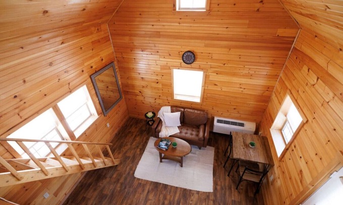 For quiet moments, the cabin features a charming loft—a peaceful nook perfect for reading, playing games, or reflecting on your day's adventures. It’s an ideal space to retreat for a bit of solitude and relaxation.
