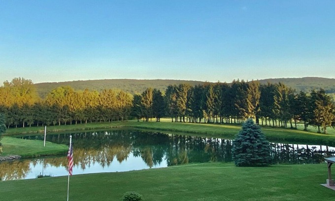 Charmingly furnished and offers two twin size bed and full ensuite bathroom. You will enjoy a separate entrance in our country inn and can enjoy lounging or enjoying a coffee or tea in the common living room area reserved for guests. Enjoy the serenity of our country setting and view of the pond from the deck. A small refrigerator is provided in room. Beautiful grounds, gazebo and walking path.
