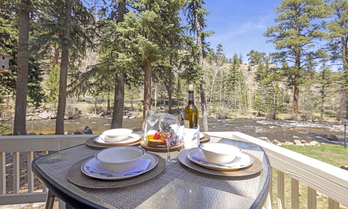 Soak in the peaceful ambiance of the Big Thompson River at Pinehenge—an Estes Park vacation rental you'll never forget! 🌊✨20-NCDO181