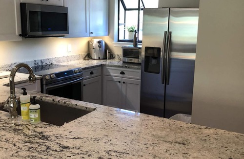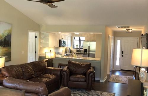 Fantastic! Newly Renovated! 2 bedroom Home on Pinehurst No 6 Golf course 12th fairway with High Speed Internet. The Magnolia master bedroom includes a king size bed, ceiling fan, smart tv, deck access, spacious walk in closet, and entrance to a private bathroom. The Pines bedroom has 2 full size beds with new memory foam mattresses, ceiling fan, tv with ROKU, deck access, spacious walk in closet, and bathroom entrance. During your stay you will enjoy all the comforts of a modern kitchen that has been totally redesigned. These modern touches include new stainless appliances, smooth top stove, dishwasher, microwave, refrigerator, and Keurig. The granite counter forms an island/bar that seats 4 and makes for a great place to converse while cooking. The main room includes a leather couch, two leather chairs, dining table for 6, 65" Smart TV, access to both decks, and fairway views. Full sized washer and dryer is located in the hall of the Pines bedroom. A large private driveway provides ample room for parking.