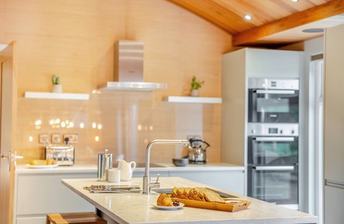 Before stepping into this single-level hideaway, take a moment to appreciate the beauty of this tranquil setting. Inside, the lodge continues to charm with its stylish wood-clad interiors and a spacious, light-filled layout. The open-plan living area serves as the hub of the home, providing a welcoming space to relax, enjoy the views, and plan your adventures. On balmy sunny afternoons, slide open the patio doors, extending the space and inviting the outside, in. As the evening draws in unwind in the cosy lounge, complete with plush seating, a Smart TV, and a wood burner for those cooler evenings. The sleek and well-equipped kitchen is perfect for preparing hearty meals, which can be shared around the round dining table or at the breakfast bar for more intimate gatherings. The bedrooms, all beautifully decorated with quirky wallpaper and top-of-the-range furniture, all feature zip-and-link beds and can be arranged as super-kings or twins on request at the time of booking. They also all have en-suite facilities – one with a bath and the others with modern showers.