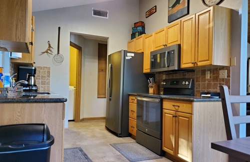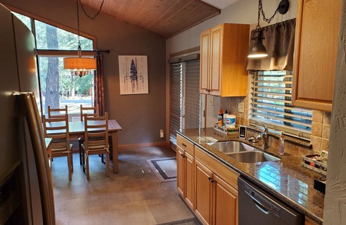 The kitchen comes fully ready with updated slate gray kitchen appliances, granite counter tops, and a complete kitchen full of all amenities anyone would need to prepare fabulous meals. Two decks and four smart HDTV's. Stream using the convenience of subscription to Hulu via Wi-Fi using Roku remotes. In addition to the two decks, the patio features beautiful wood look porcelain tile and a gas fire pit to enhance the outdoor experience. The game room offers Lazy Boy recliners, a nine-foot shuffleboard table and electric fireplace in addition to the fireplace in the great room. The cottage has comfortable quality furniture and beds from Basset, Serta, and World Market as well as IKEA. We have recently added top grain leather great room furniture from Costco. Cookware, linens, bath towels, etc. are all top quality. The great room features amazing light from the transom windows during the day and star light views in the evening peering between the massive Ponderosa pines. In the winter, the wood burning fireplace in the great room adds comfort to enjoy those chilly evenings.