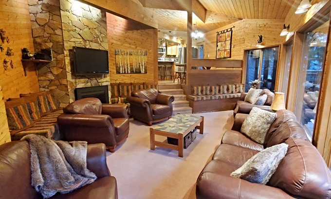 From your well equipped kitchen with bar-style island, to the dining area overlooking the large sunken living room... the open-style flow is perfect for hanging out together - with just enough separation. The living room has comfy leather couches and additional bench seating for relaxing after a day in the great outdoors.