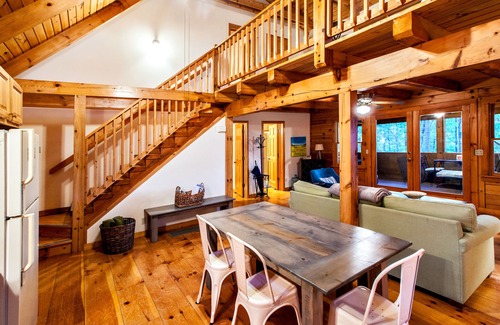 Enjoy the breeze and view from this light-filled cabin on top of a ridge. Walk to trails in the NC Wildlife Game Lands or just enjoy strolling around the gravel roads of our neighborhood, Piney Mountain -- keep an eye out for deer, birds and other wildlife. Many trails, waterfalls and outdoor adventures in the nearby area.