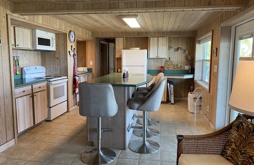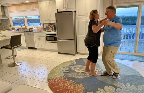 APRIL DISCOUNT 10% Located on Green Turtle Cay, The Pink Bikini was recently renovated following the 2019 Dorian Hurricane. A charming island home just a short walk from the ocean beach with 5 bedrooms, 4 bathrooms, 2 kitchens, 2 laundry facilities, a 96' dock / 16' wide spring poles including 30amp power and water and a covered fish cleaning station on Black Sound. The dock has more than 6' of water at low tide . Bikini "Top" offers a gracious living area with comfortable seating, a 72" television and a long dining room table. The eclectic bar is located just off the sunset deck. The open kitchen has an expansive island that comfortable seats 6 with a view of the sound. The primary suite has a 4 poster king bed with a walk in mermaid shower and double vessel sinks. The 2 spare bedrooms have king beds and share a bath with a walk in shower and double sinks. Bikini "Bottom" offers a king room on one end and two twins on the other. Each bedroom has their own bath. The living area combines with a galley kitchen, center island bar and comfortable seating. The French patio doors lead to the wide deck across the front offering a harbor view. The Pink Bikini has many custom and cute appointments and features. Added essentials are a generator, Aprilaire Dehumidifier/Purification and an ultraviolet water purification system, just in case. We encourage you to relax, enjoy, read, practice art, beach comb and have fun.