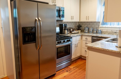 The kitchen is equipped with a full size fridge with water and ice on the door. It has a microwave, toaster and thermal 12 cup coffee pot. The kitchen is stocked with china, glassware and utensils for 4 guests. There is seating at the built in breakfast bar in the kitchen for 2 guests. We supply a small charcoal weber grill. If you would like to grill you will need to bring charcoal and lighter fluid. There is a coffee station with Regular, Decaf and Bourbon Coffee along with several teas. We also provide a Snack Basket with lots of goodies!